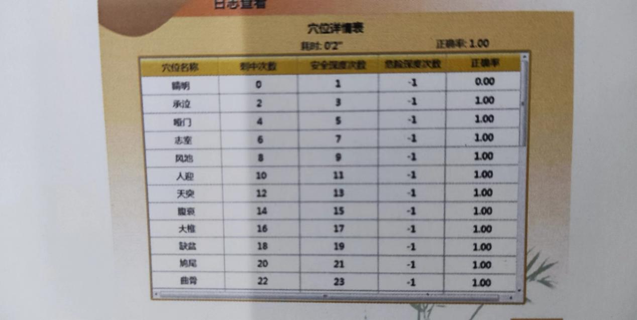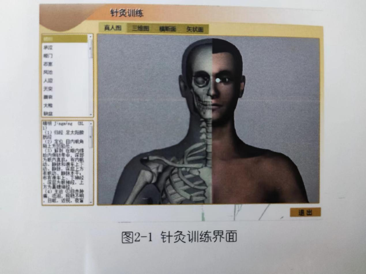 (1)针灸训练:共有34个穴位。点击其中的某一穴位,则会出现此穴位的位置、横断面、矢状面的解剖图。针灸刺中某一穴位并且针刺深度安全时,电脑真人图上会出现该穴位的位置,用绿色圆点表示,并伴有声音提示。如:天突穴、安全。如果针刺深度危险,则用红色圆点表示,并有声音提示,如:天突穴,危险。