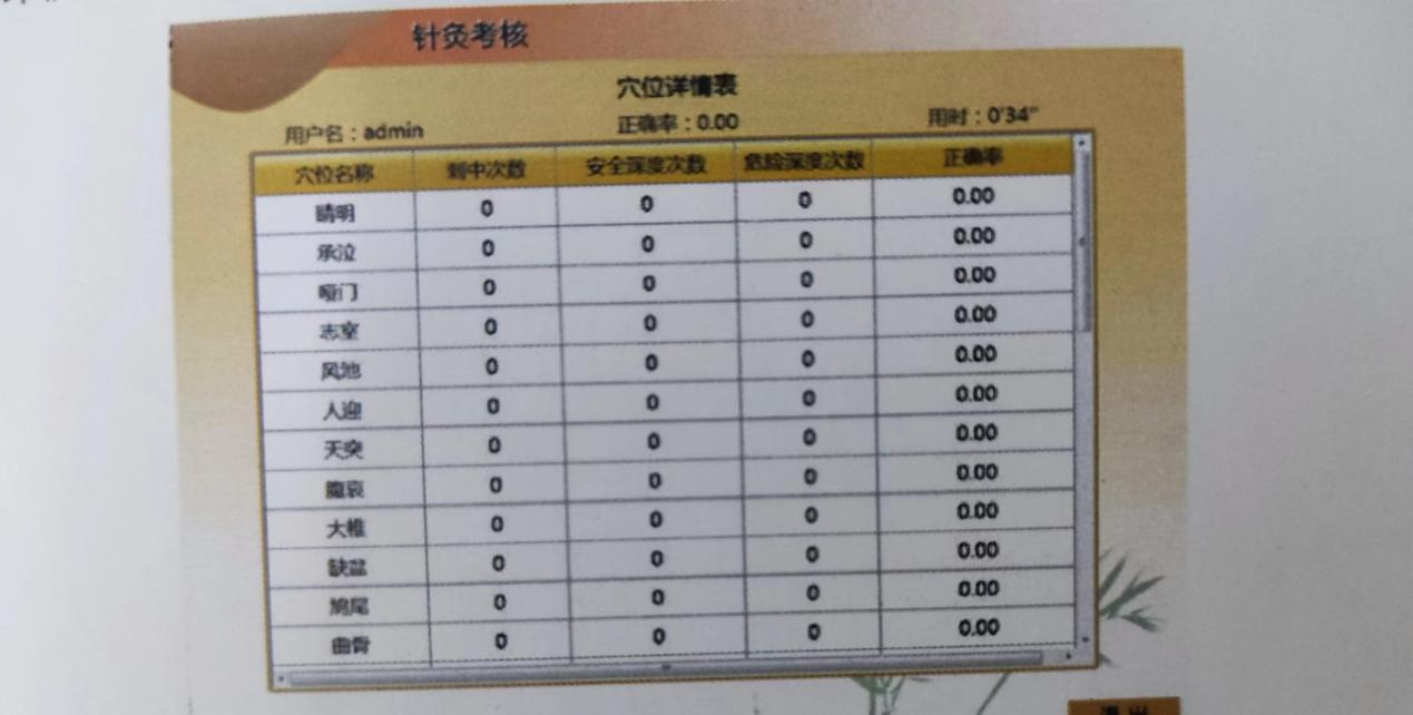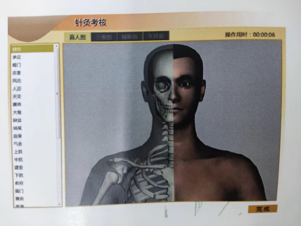 (2)针灸考核:单击需要考核的穴位,并进行该穴位的针灸操作。点击“完成”,就会进入评价界面。