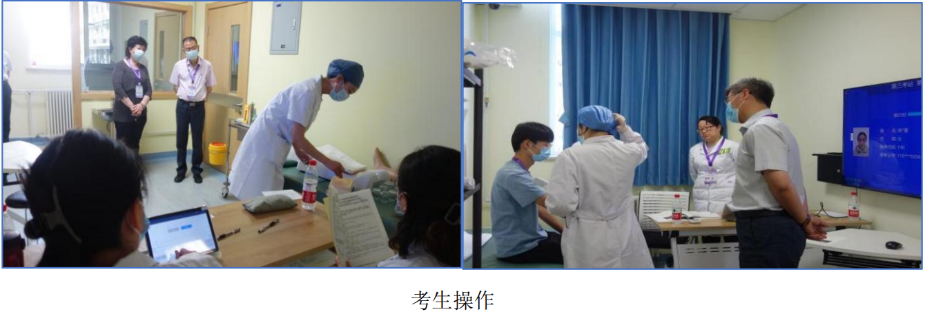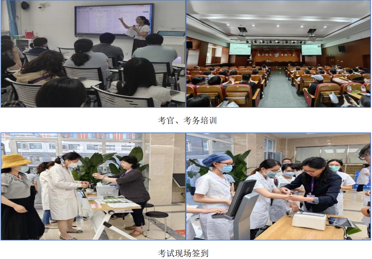 此次考试共分为三站,其中一站为笔试,二、三站为实践技能考试。考场设有安检处、存包处、签到处,均有工作人员进行引导,保证考生规范有序入场。199 名考官来自于 10 余所医院,经过专业化考前培训,严格按照考试标准进行执考,保证了考试的公平公正性。考场和考室均配有专岗考务人员,按照岗位职责就突发情况进行协调处理,为考试的顺利、高效进行提供保障。